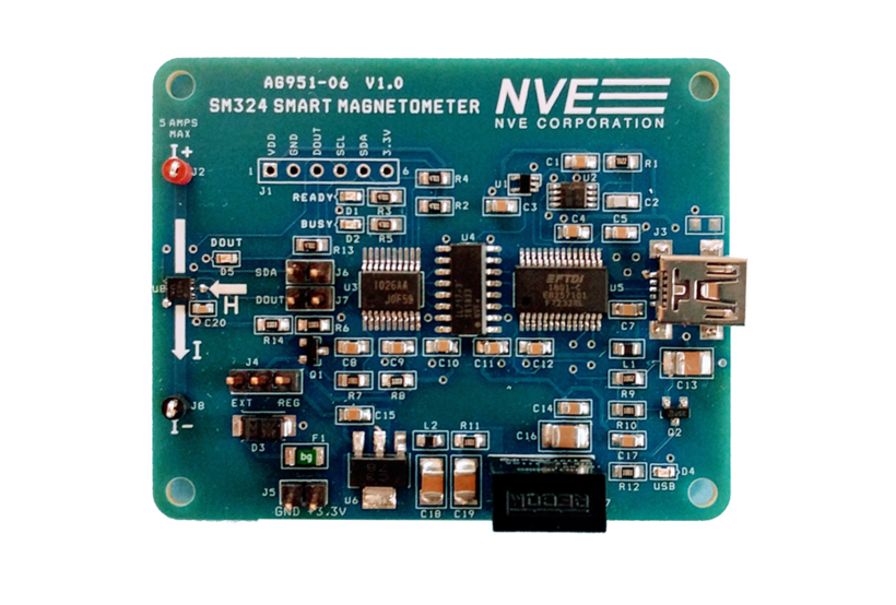 The AG951 Evaluation Board is used to test the NVE SM324 current sensor.
