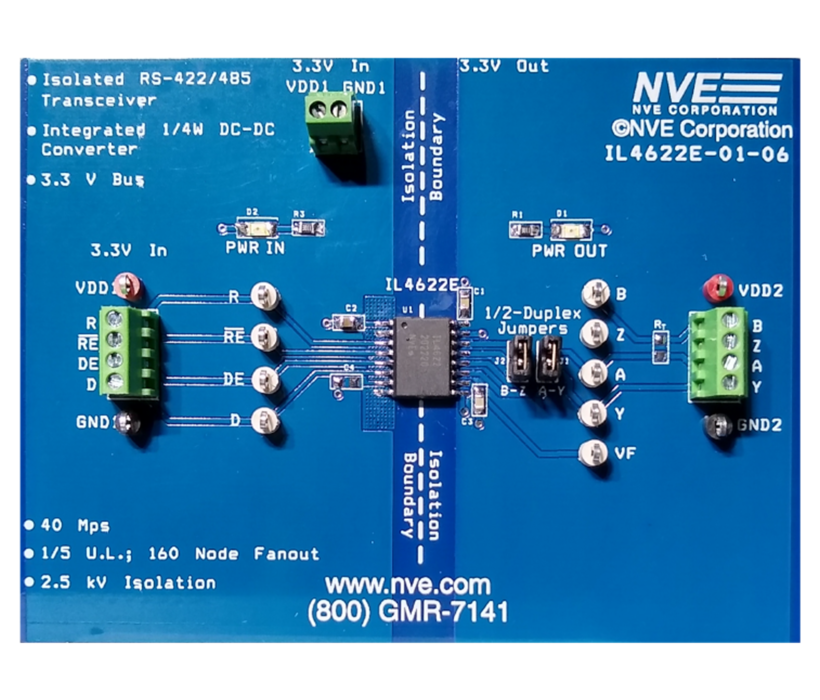 The evaluation board with the transceiver component IL4685 or IL4622 combines NVE's Isoloop technology for galvanic isolation with an RS-485 or RS 422 driver IC. In addition, a driver component is used here that also operates with 3.3V, which is supplied by an integrated DC/DC converter.