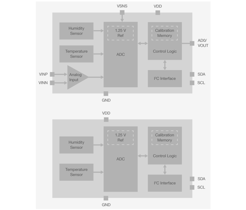 Our Si7006/13/20/21/34 family is our latest generation of I2C relative humidity and temperature sensors. All devices combine fully factory-calibrated humidity and temperature sensor elements with an analog-to-digital converter, signal processing, and an I2C host interface. The Si7013/20/21/34 sensors are designed for high-accuracy applications, while Si7006 is targeted toward lower-accuracy applications traditionally using discrete RH/T sensors.