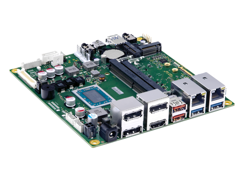 The industrial motherboard D3724-R mSTX supports the AMD Ryzen™ Embedded R2000 series processors with integrated AMD Radeon™ Vega Graphics and can be used in applications with high graphical requirements like casino gaming, medical displays, thin clients and ultra small industrial PCs. It is equipped with up to three DisplayPorts, one HDMI Port, one embedded DisplayPort and one Dual-Channel LVDS (24bit) and powers up to four independent displays in 4K resolution. Depending on the requirements for (graphical) performance, there are three motherboard versions available.