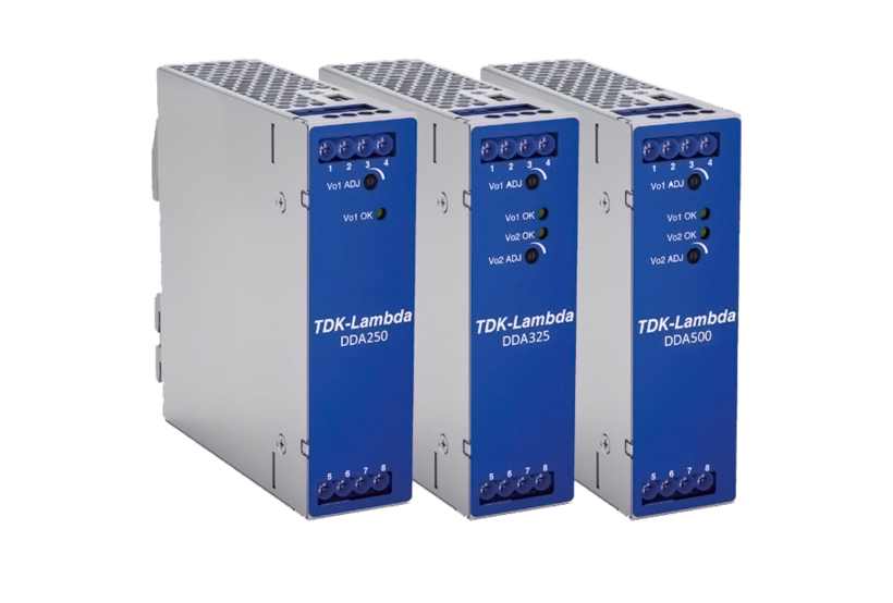 The DDA devices are extremely compact DC-DC converters with output powers up to a maximum of 500W for mounting on a DIN rail. The devices use our point-of-load converters from the i6A series without galvanic isolation. The deliberate omission of primary/secondary isolation enables outstanding efficiencies of up to 95% with a very wide range of input and output voltages. With an input voltage range of 9-53Vdc, the devices can be operated universally on bus voltages of 12V, 24V and also 48V. The output voltage range extends from 3.3V to 24V. Typical fields of application are industrial applications as well as test and measurement systems in which all system voltages are referenced to a common ground. No galvanic isolation is required here and the DDA series is a flexible solution for branching off additional voltages from an existing low-voltage bus. The DDA series comprises 3 models - one type with nominal 12V (adjustable from 3.3V to 15V) and maximum 20A current; one type with dual output +12V/20A and +5V/20A (each adjustable from 3.3V to 15V); and another type with dual output +12V/14A and -12V/8A (each adjustable from 3.3V to 24V). The output power of a DDA is 250W with convection cooling. Thanks to a forced air flow, the types with dual output can be loaded up to a maximum of 500W.