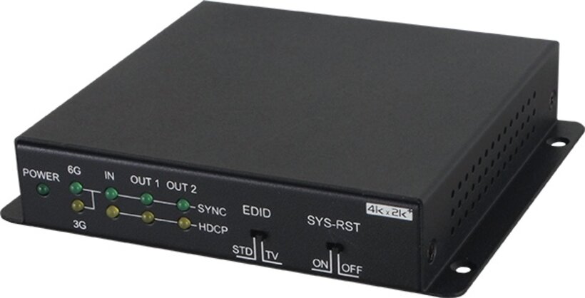 Dieser 1x2 HDMI Splitter mit HDCP 2.2 ist eine fortschrittliche Lösung für die Aufteilung und Verteilung eines einzelnen HDMI-Eingangs auf zwei HDMI-Ausgänge. Er bietet leistungsstarke Audio- und Videoausgänge bis zu 4K2K @60Hz (YUV444). Er unterstützt Pass-through von digitalen Audioformaten wie LPCM 7.1CH, Dolby TrueHD, Dolby Digital Plus, DTS-HD Master Audio und Dolby Atmos mit Audio-Sampling-Raten bis zu 192kHz. Der Ein- und Ausgabestatus wird auf der Vorderseite angezeigt. Die System-Reset-Funktion ermöglicht es dem Gerät, das Fernsehgerät automatisch auf den Standard-HDMI-Eingang zurückzusetzen.