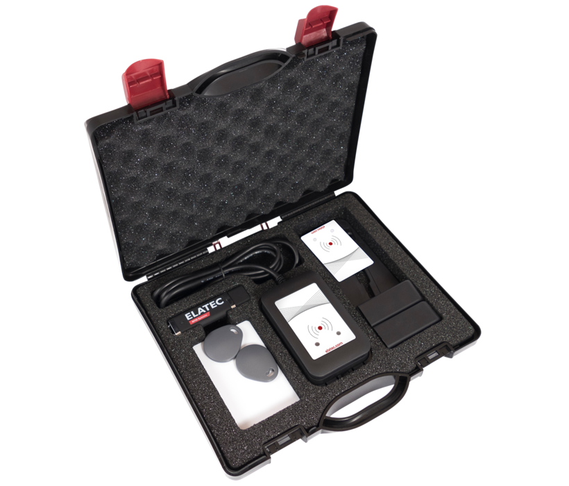 The TWN4 Tech Tracer Kit includes the TWN4 MULTITECH reader in a desktop USB housing with holders, a selection of different transponders and a USB stick with software development kit and documentation.