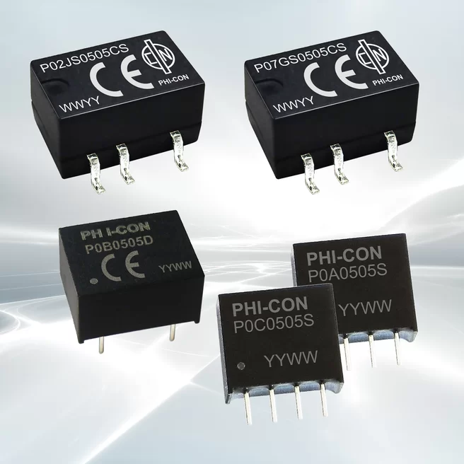 Die NVE Isoloop-Daten- und Schnittstellenkoppler nutzen Logikpegel von 3,3 und 5 V, entsprechend sind DC/DC-Wandler mit 3,3 oder 5 V Eingangs- und/oder Ausgangsspannung erforderlich, die es in den Baureihen P0A, P0B, P0C, P02JS und P07GS im PHI-CON-Sortiment in SMD-Ausführung und bedrahtet ab 0,25 W gibt. Sie haben Leerlaufströme von teilweise unter 10 mA, Isolationsspannungen bis 3000 V und Koppelkapazitäten von nur 20 bis 60 pF.
