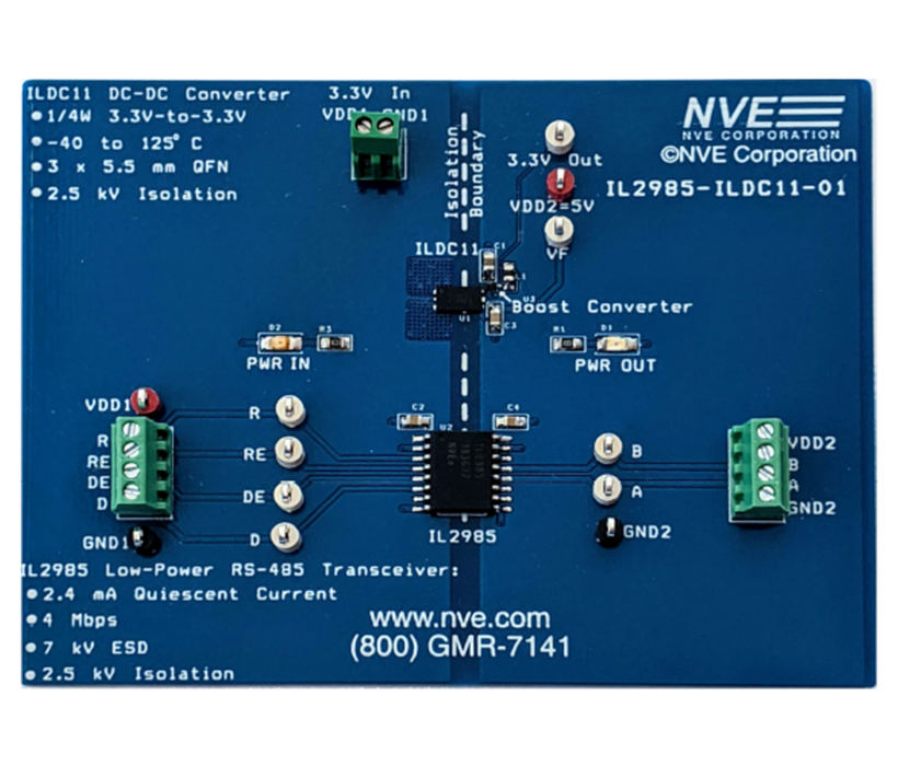Das Evaluation Board für den IL2985 inklusive des neu entwickelten extrem kleinen DC/DC Wandlers von NVE. Der ILDC11 ist ein 3,3V auf 3,3V DC/DC Wandler und liefert bis zu 250mW.
