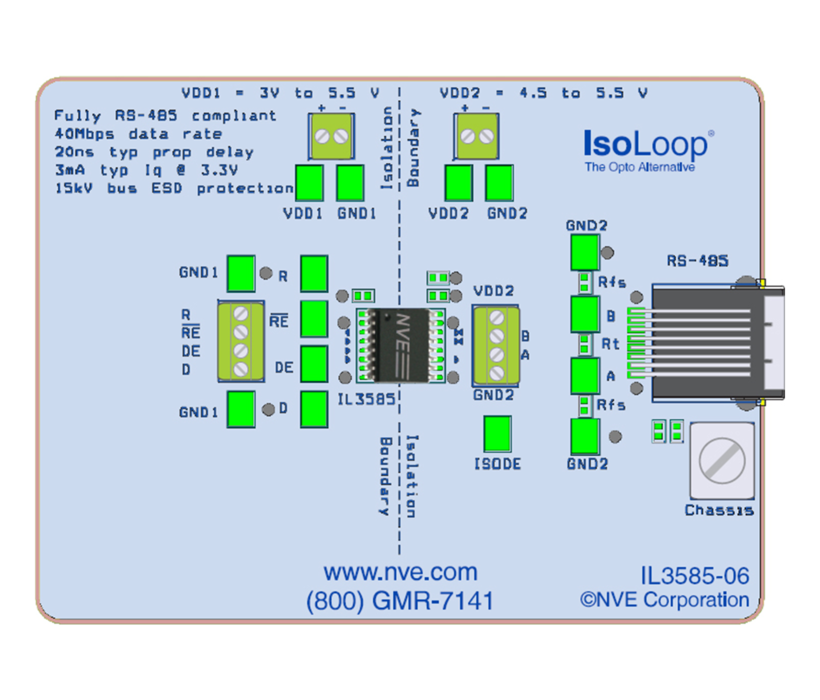 Das Evaluation Board mit dem Transceiver-Baustein IL3585 kombiniert NVE die Isoloop-Technologie zur galvanischen Trennung mit einem RS-485 Treiber-ICs . Der Baustein bietet durch interne pull-up und pull down Widerstande eine Fail-safe-Funktion bei unterbrochener Busleitung.