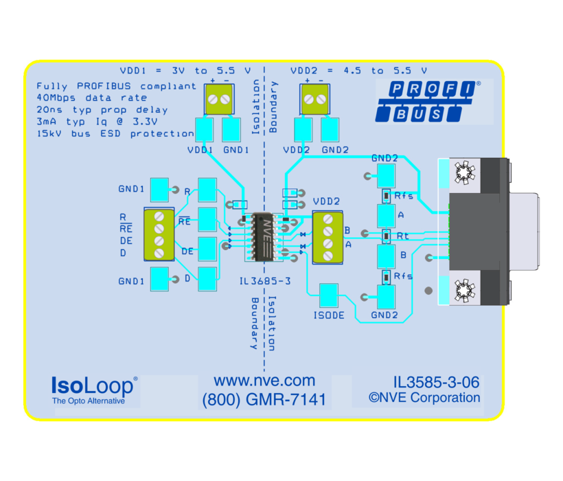 Das Evaluation Board mit dem Transceiver-Baustein IL3685 kombiniert NVE die Isoloop-Technologie zur galvanischen Trennung mit einem RS-485 Treiber-ICs . Der Baustein erfüllt die scharfen Profibus Anforderungen. Auf dem Board wird ein 0,15"-SOIC Baustein verwendet.