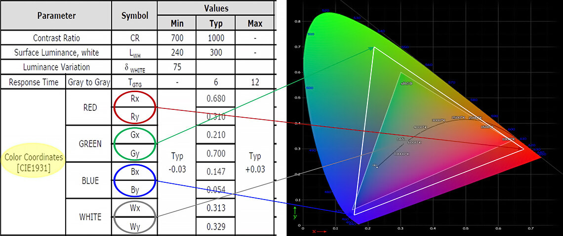 Für eine optimale Darstellung muss der Farbraum, der durch das Display dargestellt werden kann, möglichst weit sein. Die Abbildung zeigt, wo die in der Tabelle angegebenen Koordinaten der Primärfarben im Farbdiagramm zu finden sind. Nur diejenigen Farben, die innerhalb des aufgespannten Dreiecks (weiß dargestellt) liegen, können dargestellt werden.