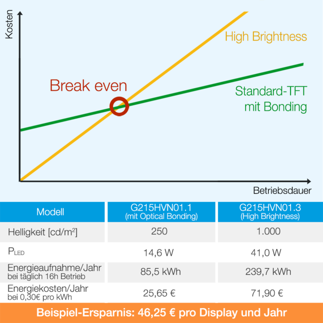 Ein Standard-Display benötigt weniger Energie für das LED-Backlight, um genauso gut ablesbar zu sein. Die Grafik zeigt, dass sich die beim Optical Bonding anfallenden höheren Initialkosten in kurzer Zeit amortisieren. Sind viele Displays installiert, z.B. in Supermärkten, ergibt sich schnell ein fünf- bis sechsstelliger Betrag pro Jahr.