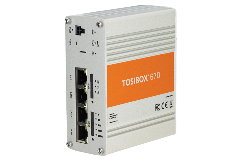 Die TOSIBOX 670 eignet sich ideal als Haupt- oder Backup-Internetquelle, wenn eine stabile Verbindung und ein hoher Datendurchsatz erforderlich sind. Die vielseitigen Konnektivitätsoptionen, die in Verbindung mit der hochmodernen Cyber-Sicherheitstechnologie von TOSIBOX genutzt werden, ermöglichen vielfältige Anwendungsszenarien. Das widerstandsfähige Gehäuse aus einer Aluminiumlegierung und der kleine Formfaktor sind ideal für robuste Montagebedingungen.