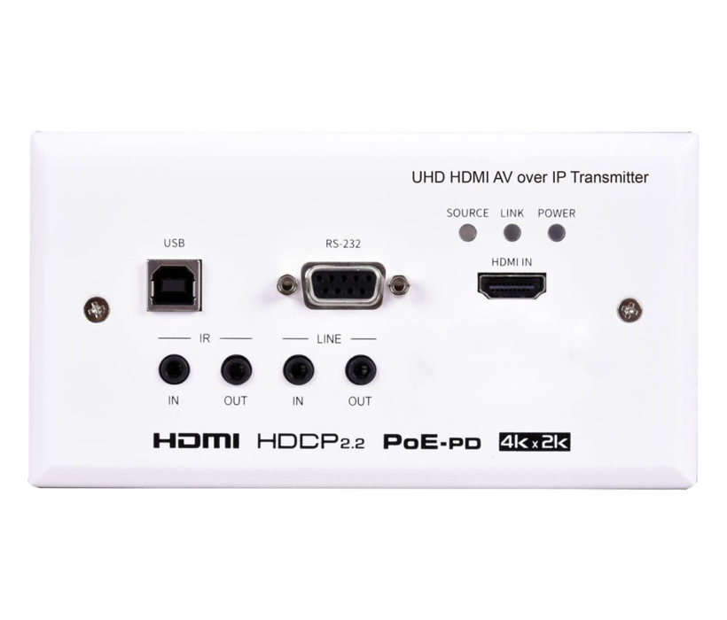 Der AVoIP-Wandplattensender ist Teil eines 4K-UHD-Multifunktionserweiterungssystems, das in der Lage ist, HDMI-Signale zusammen mit KVM über Cat.5e/6/7-Netzwerkkabel zu verlängern und UHD-Videosignale, Audio und USB bis zu 100 m auf einem einzigen Kabel zu übertragen. Die Übertragungsdistanz kann durch den Einsatz von Gigabit-Netzwerk-Switches weiter verlängert werden (bis zu 100 m pro Segment), so dass der Benutzer das System ohne Signalverlust oder Verzögerung kaskadieren kann. Durch die Kopplung mit einer bestehenden Empfangseinheit der Serie mit eingebautem 3-LAN-Ethernet-Switch kann ein Basissystem erweitert und ausgebaut werden, ohne dass ein externer Netzwerk-Switch erforderlich ist. Mit diesem Gerät können Sie auch ein einzelnes AV-Signal an eine große Anzahl von Empfängern innerhalb desselben lokalen Netzwerks senden. Darüber hinaus kann dasselbe Multicast-Signal verwendet werden, um große Videowände mit mehreren Bildschirmen mit erstaunlicher Einfachheit zu erstellen. Dieses System ist sowohl für private als auch für kommerzielle Installationen geeignet. Die USB-Funktionalität ermöglicht es dem System, wie ein Remote-USB-Hub zu agieren, der in Kombination mit der Videoerweiterungsfunktion eine flexible Remote-KVM-Plattform bietet. Die Konfigurationsinformationen werden über das On-Screen-Display (OSD) bereitgestellt. Das Gerät kann über WebGUI, Telnet und den IP Master Controller gesteuert werden.