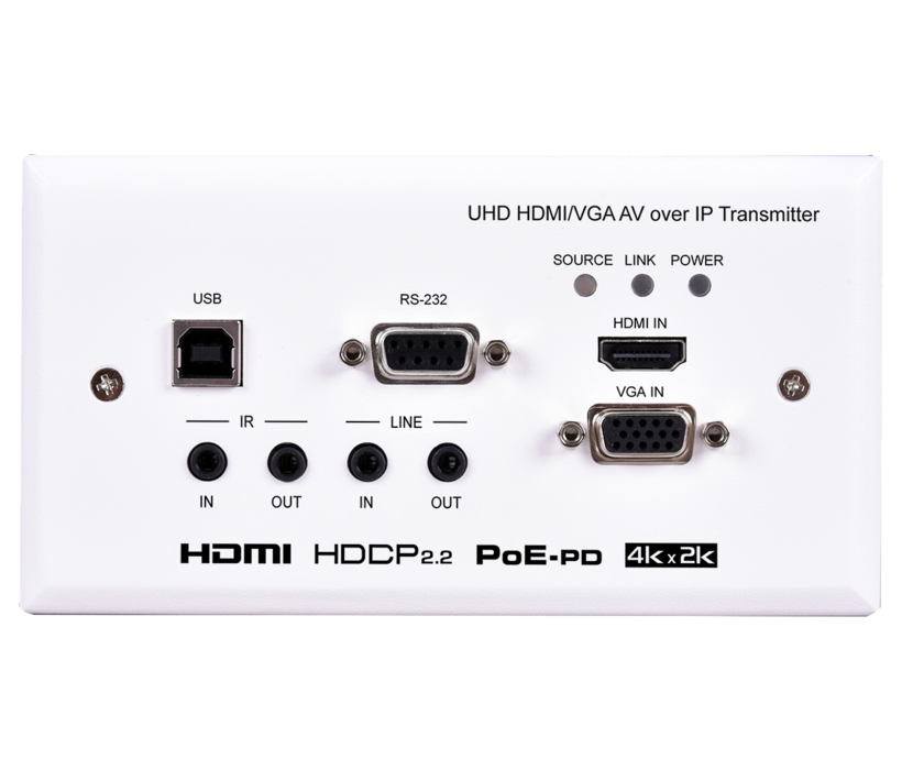 Der AVoIP-Wandplattensender ist Teil eines 4K-UHD-Multifunktionserweiterungssystems, das in der Lage ist, HDMI- oder VGA-Signale zusammen mit KVM über Cat.5e/6/7-Netzwerkkabel zu verlängern und UHD-Videosignale, Audio und USB bis zu 100 m auf einem einzigen Kabel zu übertragen. Die Übertragungsdistanz kann durch den Einsatz von Gigabit-Netzwerk-Switches weiter verlängert werden (bis zu 100 m pro Segment), so dass der Benutzer das System ohne Signalverlust oder Verzögerung kaskadieren kann. Durch die Kopplung mit einer bestehenden Empfangseinheit der Serie mit eingebautem 3-LAN-Ethernet-Switch kann ein Basissystem erweitert und ausgebaut werden, ohne dass ein externer Netzwerk-Switch erforderlich ist. Mit diesem Gerät können Sie auch ein einzelnes AV-Signal an eine große Anzahl von Empfängern innerhalb desselben lokalen Netzwerks senden. Darüber hinaus kann dasselbe Multicast-Signal verwendet werden, um große Videowände mit mehreren Bildschirmen mit erstaunlicher Einfachheit zu erstellen. Dieses System ist sowohl für private als auch für kommerzielle Installationen geeignet.