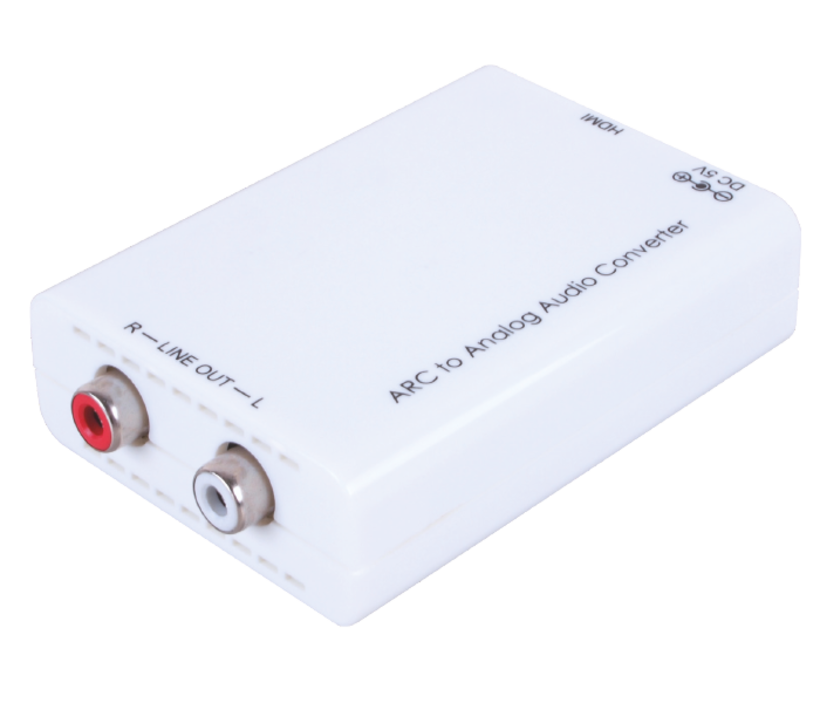Der ARC-zu-Analog-Audio-Konverter extrahiert das Audiosignal aus dem HDMI-ARC-Anschluss (Audio Return Channel) eines HDTV-Geräts und wandelt es in ein analoges Stereosignal um. Dies ermöglicht den Anschluss eines HDTV-Geräts mit HDMI-Ausgang an nicht mit HDMI ausgestattete Verstärker, AV-Receiver oder Aktivlautsprecher. Er unterstützt HDMI-Audio-Abtastraten von bis zu 192 kHz und analoge Stereo-2CH-Audioausgabe.