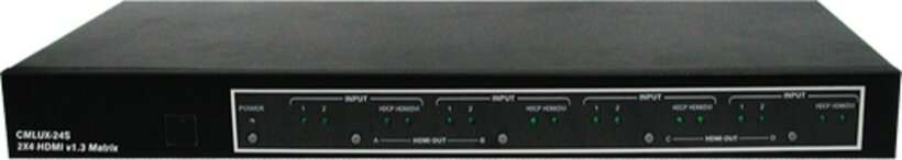 Die CMLUX-24S ist eine Hochleistungs-HDMI 1.3 Matrix mit zwei Eingängen und vier Ausgängen für den Anschluss vieler HDMI- Quellen und Senken. Die Bedienung ist dank der Fernbedienung zum Umschalten zwischen den einzelnen Geräten sehr einfach. Des Weiteren kann die HDMI v1.3 Matrix Deep-Color-Video und Digitalaudio per Bitstream übertragen und unterstützt außerdem HDMI 1.3, HDCP 1.1 und DVI 1.0.