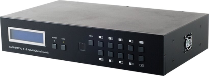 Die 8x8 HDMI Matrix über CAT5e/6/7 unterstützt die Übertragung von Videos in einer Auflösung bis 1080p Full HD und 1920x1200, 60Hz. Es unterstützt außerdem Audio Formate wie LPCM 7.1CH, Dolby TrueHD, Dolby Digital Plus und DTS-HD Master Audio sowie 3D Formate für 3D TVs und -Quellen. Steuerung durch IR, RS-232, Telnet oder WEB GUI möglich.