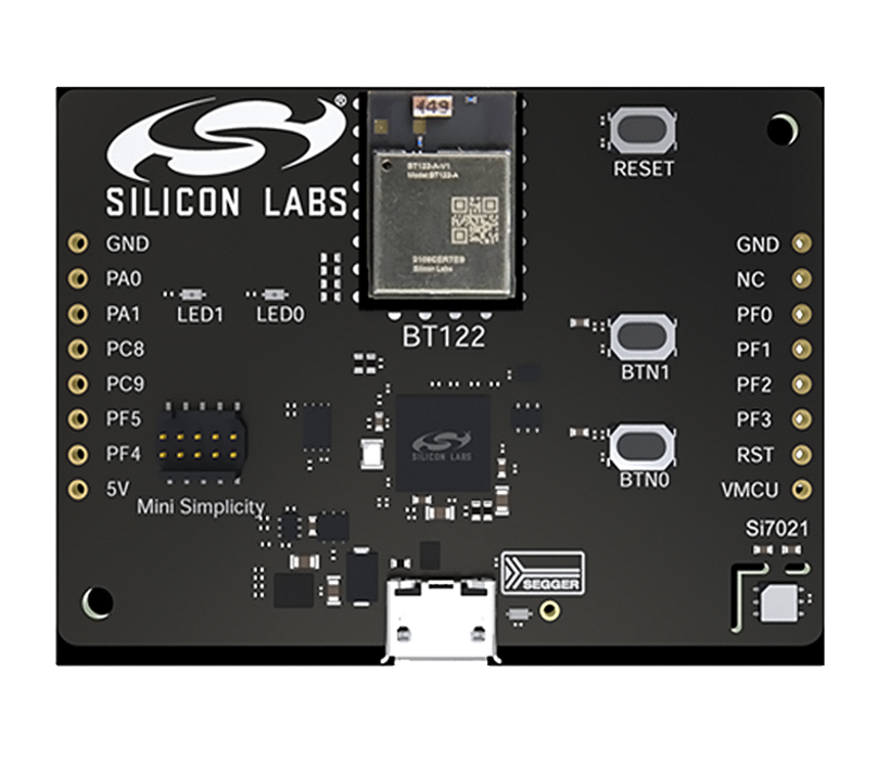 Das BT122 Dev Kit ist ein kleines Formfaktor-Kit zur Evaluierung des BT122 Dual-Mode Bluetooth-Moduls. Das Board enthält 2 Drucktasten, 2 LEDs, einen Temperatur- und Luftfeuchtigkeitssensor (Si7021) und einen integrierten J-Link Debugger mit Unterstützung für eine UART-zu-USB-Brücke (VCOM). Es enthält auch einen Mini-Simplicity-Anschluss, der Stromverbrauchsmessungen mit BRD4001A und Energy Profiler ermöglicht, sowie Breakout-Pads für alle Modul-Pins.
