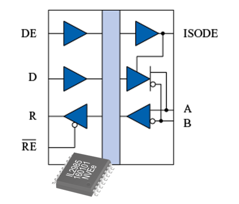 With the IL2985 transceiver module, NVE combines Isoloop technology for galvanic isolation with a particularly power-saving RS-485 driver IC. The device offers a fail-safe function in case of an interrupted bus line due to internal pull-up and pull-down resistors.