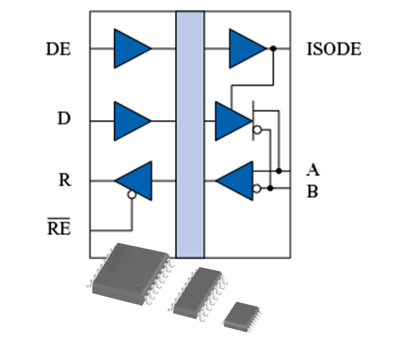 With the IL3585 transceiver device, NVE combines Isoloop technology for galvanic isolation with an RS-485 driver IC. The device offers a fail-safe function in case of an interrupted bus line by means of internal pull-up and pull-down resistors. The IL3585 is pin and function compatible with other RS-485 devices in 0.15" or 0.30" 16-pin SOIC packages.
