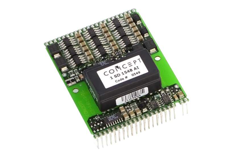 The 1SD1548AI IGBT driver is based on Power Integrations highly approved SCALE-1 chip set that was developed specifically to enable IGBTs to be reliably-driven and safely operated. The driver features a high gate current of ±48 A and a high power output of 15 W. It has been specially developed for high-frequency applications (e.g. resonant converters) with a high gate power requirement or for high gate-current driving applications (e.g. parallel connection of high-power IGBT modules). The driver features electrical isolation between the control electronics and the power section. The gate voltage is ±15 V. The driver is equipped with a programmable Vce-monitoring function for protection against short circuit and overcurrent. The integrated, electrically-insulated DC/DC converter supplies a drive power of 15 W.