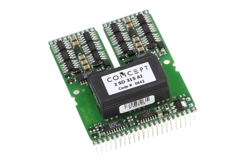 The 2SD315AI series comprises 2-channel SCALE-1 driver cores for IGBTs up to 1700 V (optionally to 3300 V). Its gate current capability of ± 15A is optimized for IGBTs from 200 A to typically 800 A. The two drive channels feature electrical isolation between the control electronics and the power section. The gate voltage is 0 / +15 V or ±15 V. Each channel is equipped with a programmable Vce-monitoring function for protection against short circuit and overcurrent. The driver is equipped with the award-winning CONCEPT SCALE-1 driver chipset and can be operated in two modes: either with two independent driver channels or as a half-bridge driver with internal dead-time generation. The integrated electrically-isolated DC/DC converter supplies a drive power of 3 W per channel.