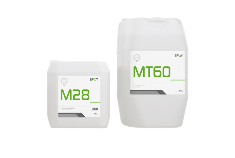 EFOY Pro fuel cells are direct methanol fuel cells that are operated with methanol as the fuel. The methanol is filled into specially developed EFOY fuel cartridges. Depending on requirements, EFOY fuel cartridges are available in 5, 10 and 28 liter sizes. High-purity and clean methanol is required for the reliable operation of EFOY Pro fuel cells. To ensure maximum operational safety, every filling is monitored by SFC quality management. The maximum operating time can only be guaranteed if original EFOY fuel cartridges are used.