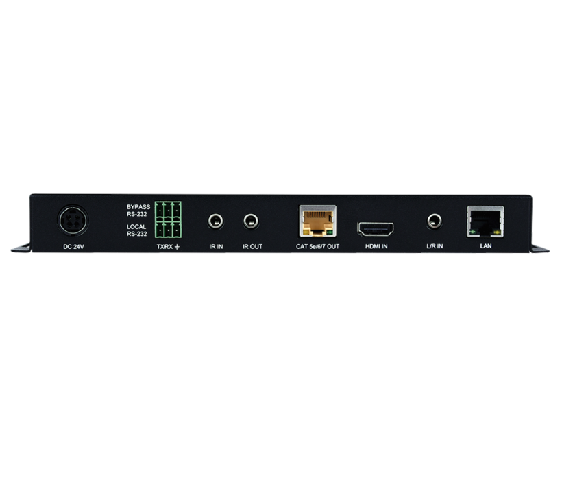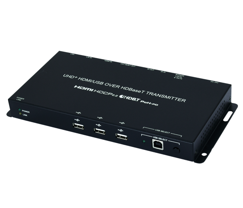 CH-2606TX adopts HDBaseT 2.0 technology for extending uncompressed 4K and HD video, audio, Ethernet, control and power along a single Cate. 5e/6/7 cable up to 100 meters. When paired with this unit’s standard Receiver, 2 switchable USB 2.0 host (Type B) connections are available (1 on the Transmitter, 1 on the Receiver) which can connect to devices on up to 6 USB 2.0 (Type A) ports (3 on the Transmitter, 3 on the Receiver) forming a highly flexible KVM extension configuration (Note: Only 1 USB host may be active at a time). This Transmitter (PD) may be powered locally using a standard power supply, or it can be powered by PoH (Power over HDBaseT) provided by a compatible Receiver (PSE), This unit is controllable via front panel button and RS-232.