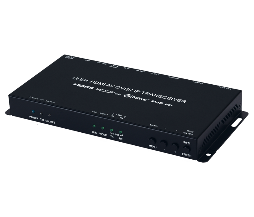 This Transceiver is designed for high-quality, IP routable, AV extension with zero latency. Each single Transceiver can be confi gured as either a Transmitter or a Receiver depends the requirement of installation facility. The 4K@60 high quality video with HDR 10 bits and multi-channel HD Bitstream audio are able to transmit in pass through mode over Cat.6A up to 100m extension.